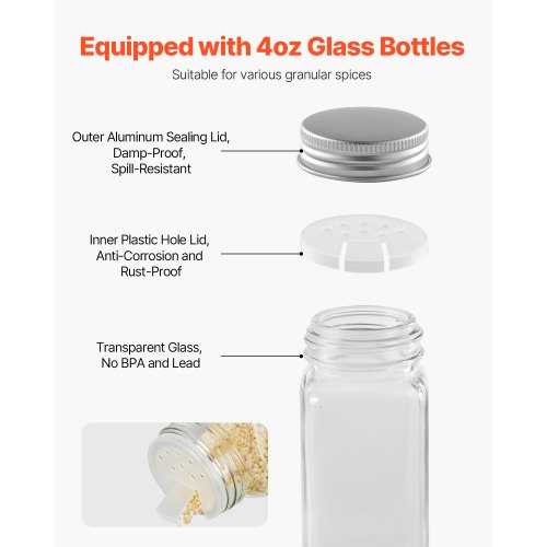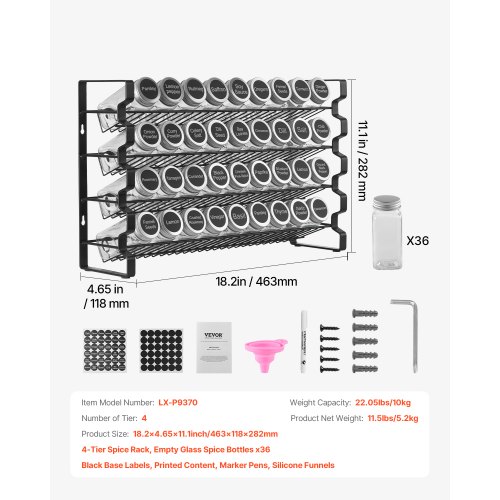VEVOR 4-stöckiges Gewürzregal Gewürzhalter mit 36 leeren Gewürzgläser & Gestell & Gewürzetiketten & Trichter-Komplettset, Gewürz-Organizer für Küchen Schrank Speisekammer (463 x 118 x 282 mm)