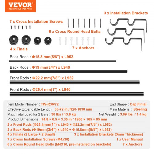 VEVOR Gardinenstangen Innenlauf 2-Läufig, 183-366 cm Gardinenstangen 13,6 kg Tragfähigkeit mit Abgerundetem Kopf & Halterung - Dekorative Fenster für Wohnzimmer Schlafzimmer Fenster / Schwarz