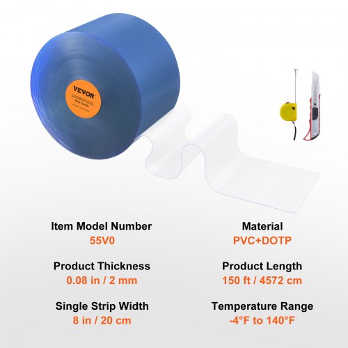 VEVOR Streifenvorhang, 150' Länge, 8" Breite, 0,08" Dicke, klare, glatte Kunststoff-Türstreifen, PVC-Vorhangstreifen-Tür-Großrolle für Lagerhallen, Fabriken, Supermärkte, Einkaufszentren, Hallen, Garagen