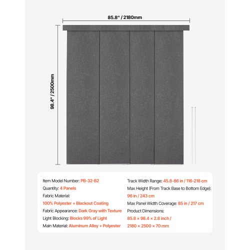 VEVOR Flächenvorhänge, ausziehbare Schiene von 116 cm bis 218 cm (B), zuschneidbare Flächenvorhänge bis 243 cm (H), Verdunkelungs-Schiebegardinen für Schiebetüren Terrassentüren Dunkelgrau