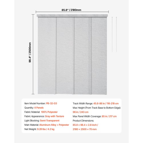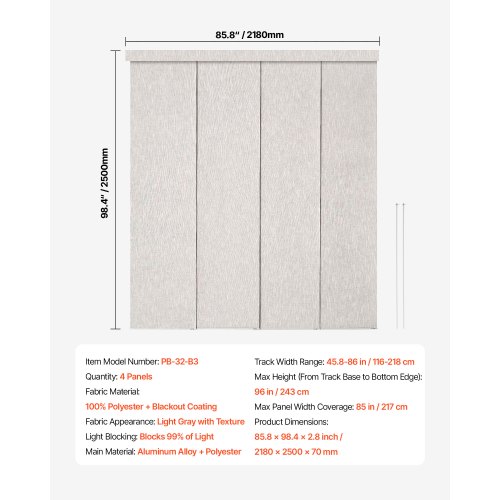 VEVOR Flächenvorhänge, ausziehbare Schiene von 116 cm bis 218 cm (B), zuschneidbare Flächenvorhänge bis 243 cm (H), Verdunkelungs-Schiebegardinen für Schiebetüren Terrassentüren Hellgrau