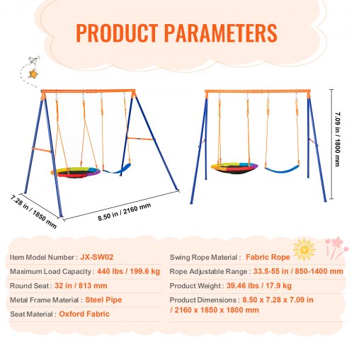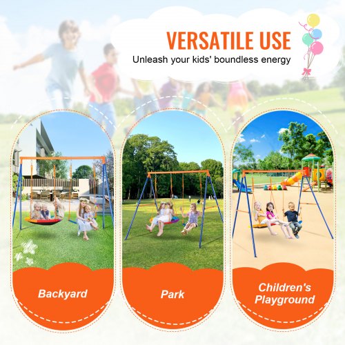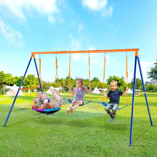 VEVOR Schaukel-Sets für den Garten, Schaukel-Set mit einer Tragkraft von 272 kg, mit 1 Tellerschaukelsitz, 2 Schaukelsitzen mit Gurten, robustem A-Rahmen-Schaukelständer aus Metall und verstellbarem Seil, Schaukel-Set für den Außenbereich für Kinder