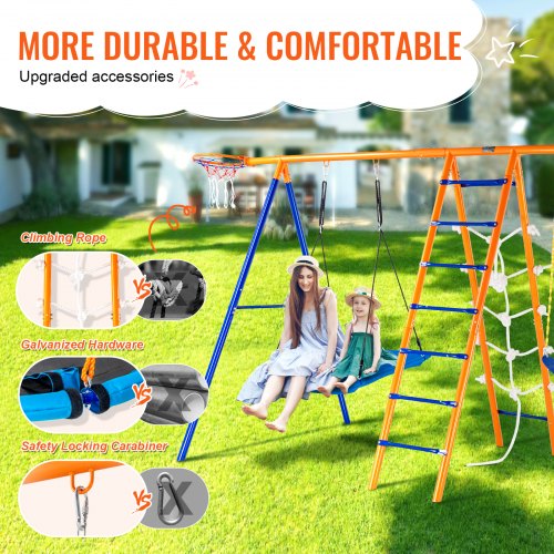 VEVOR Schaukel-Sets für den Garten, 6-in-1-Schaukel-Set mit 2 Schaukeln, Trapezstange, Kletterleiter, Kletternetz und Basketballkorb, 200 kg Tragkraft, robustes Metall-Schaukel-Set für den Außenbereich für Kinder ab 3 Jahren