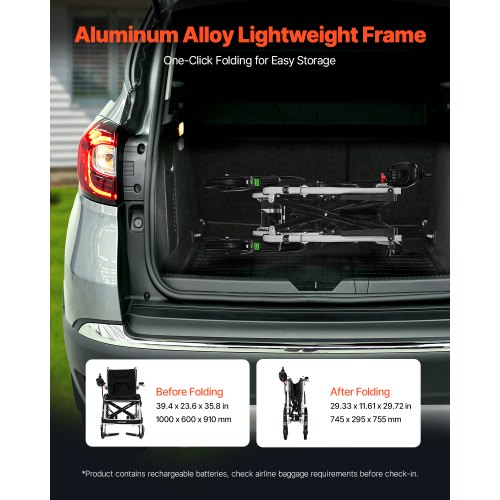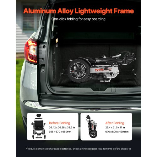 VEVOR Elektrischer Rollstuhl, Tragkraft 136 kg, Breite 45 cm, leichter, faltbarer, motorisierter Elektrorollstuhl, Reichweite bis zu 20 km, Geländegängiger Stuhl aus Aluminiumlegierung