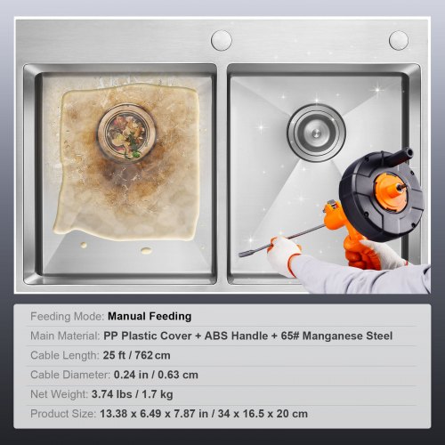 VEVOR Rohrreinigungsspirale 0,63x762cm Federstahlkabel Abflussreiniger mit Trommel Manuell&Elektrisch Manuelle Zufuhr Rohrreinigungswelle Rohrreinigungsgerät für WC Abwasserkanal Bodenabfluss