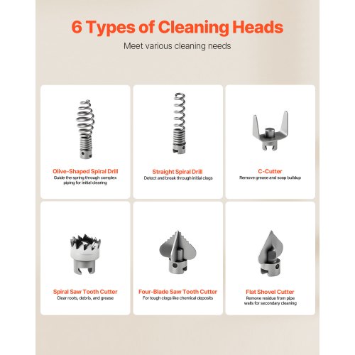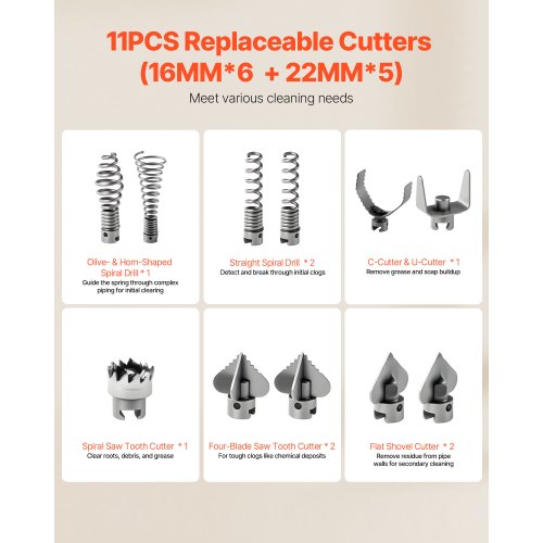 VEVOR Rohrreinigung 390W Rohrreinigungsgerät Spirale 15 mm x 13 mm kompakter elektrischer Abflussreiniger mit 8 auswechselbaren Messer