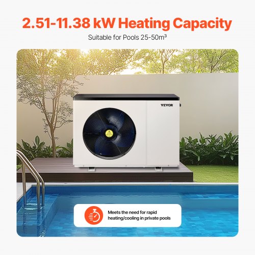 VEVOR Elektrische Pool-Wärmepumpe, 2,51–11,38 kW Heizleistung, energiesparende Poolheizungen mit variabler Frequenz für 25–50 m³ Aufstellpools, Heiz- und Kühlpool-Warmwasserbereiter AC 220–240 V 50 Hz