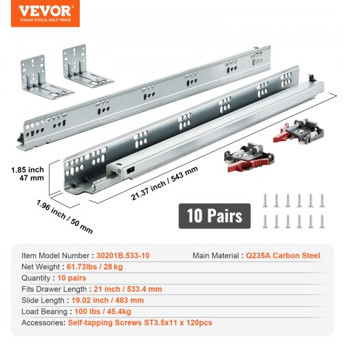 VEVOR 6x Schubladenschienen 547 x 61 x 54 mm Auszugsschienen 45,4 kg(Statisch)/36,3 kg(Dynamisch) Soft-Close Schienen für Schubladen Vollauszug Kohlenstoffstahl Schubladen Schienensystem