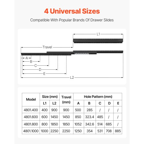 VEVOR Schubladenschienen Schulbladenauszug 1219,2 mm Vollauszug Schienen für Schubladen Doppel Kugelgelagert Schubladen Schienensystem