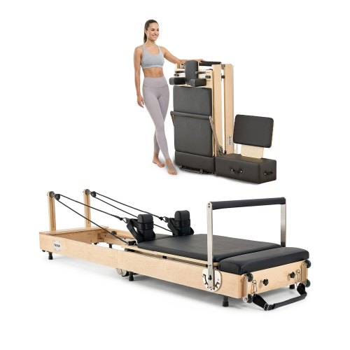 VEVOR faltbarer Pilates Reformer Trainingsgerät aus Holz für den Einsatz im Heim-Fitnessstudio, Pilates-Bett mit doppeltem Widerstand – Feder & Kordel, Ausrüstung mit Sitzbox, bis zu 181,44 kg