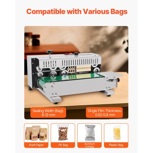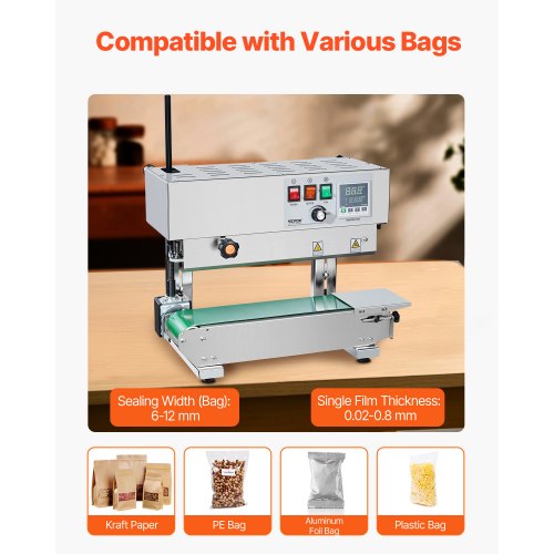 VEVOR Durchgehende Beutelband-Versiegelungsmaschine, 0,24-0,47 Zoll/6-12 mm Siegelbreite, vertikale Bandsiegelmaschine mit digitaler Temperaturregelung, Beutelsiegelgerät aus Edelstahl für 0,02-0,8 mm starke Plastikbeutelfolien
