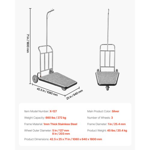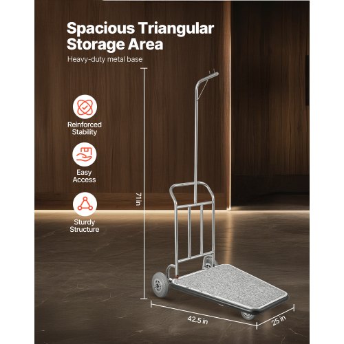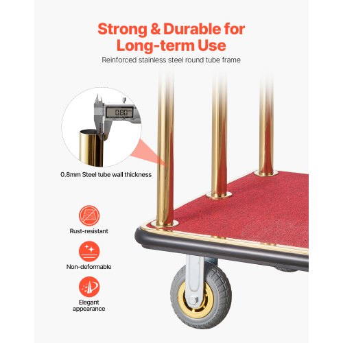 VEVOR Hotelgepäckwagen, 500 kg Tragkraft, Edelstahl-Pagenwagen mit gebogenen Pfosten, Parkservice-Wagen mit rotem Teppichboden & 15 cm Gummirädern, ideal für Hotels, Eigentumswohnungen, Resorts