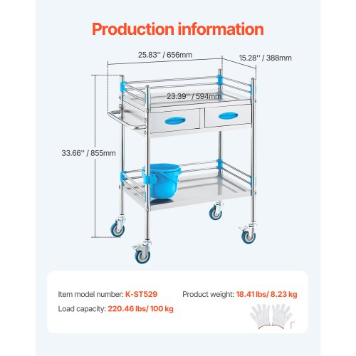 VEVOR Zweistöckiger Laborwagen Gerätewagen Medizintechnik Servierwagen 201 Edelstahl Tragbar Abräumwagen mit Schubladen 100 kg Tragfähigkeit, 710 x 421 x 785 mm (mit Griff) Labor Rollwagen