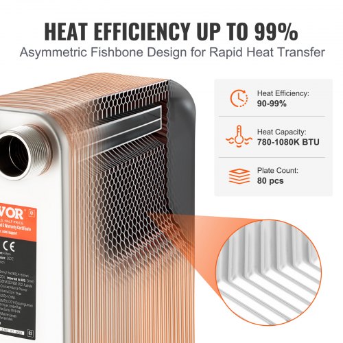 VEVOR Wärmetauscher,127 x 305 mm, 80 Platten, gelöteter Plattenwärmetauscher, Kupfer/316L Edelstahl Wasser-Wasser-Wärmetauscher für Fußbodenheizung, Warmwasserbereitung, Schneeschmelze, Bierkühlung