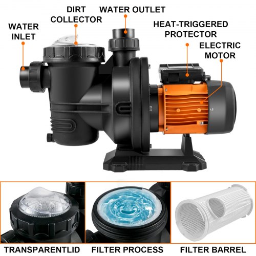 VEVOR Schwimmbadpumpe 1 PS 750 W Poolpumpen Max. Durchfluss 15000 L/H Filterpumpe Geschwindigkeit 3450 U/min Umwälzpumpe Max. Temperatur 50° C Sandfilter Pool ideal für Schwimmbäder Thermalbäder SPA