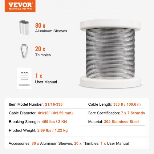 VEVOR Drahtseil-Set, Ф1,59mmx100,6m, 304 Edelstahlkabel mit 80 Hülsen und 20 Kauschen, 2kN Bruchfestigkeit, 7x7 Litzen, Marine-Flugzeugqualität für Handläufe, Treppen, Terrassenzäune im Außenbereich