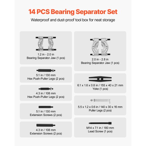 VEVOR Lagerabzieher Set 14-tlg. 5 t Lagertrenner, Ritzelradlager Ausbau Set mit 2/2,8 Zoll Backen, Hochleistungs-Lagerspalter-Werkzeugset mit Koffer Abziehersatz