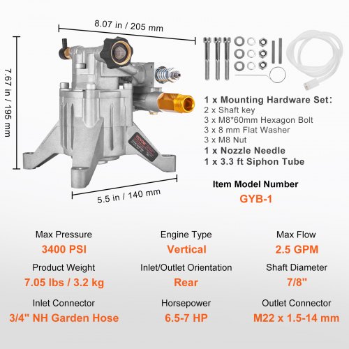 VEVOR Hochdruckreinigerpumpe, 7/8 Zoll Welle vertikal, 3100 PSI, 2,5 GPM, Ersatz-Hochdruckreinigerpumpen-Set mit 5 Düsen, Hardware und Siphonrohr, bis zu 150 Stunden, Hochdruckreiniger Ersatzpumpe