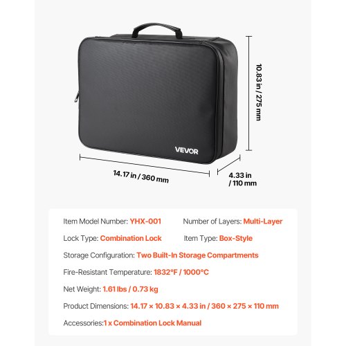 VEVOR feuerfeste Dokumententasche Aktentasche, 1000 °C wärmeisolierte, wasserfeste Dokumentenaufbewahrungstasche mit Schloss, tragbare & Geldtasche für Reisepässe wichtige Dokumente Akten Schwarz