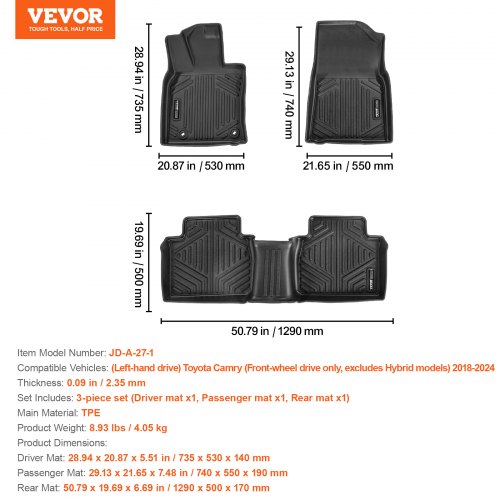 VEVOR Auto-Fußmatten passend für Toyota Camry 2018–2024 3-teilig, Einlagen für die vordere und zweite Reihe, wetterfeste maßgeschneiderte Fußmatten aus TPE, sichere Bodeneinlagen für SUV Schwarz