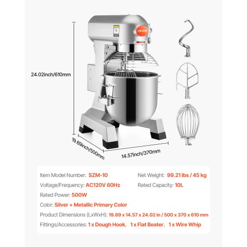 VEVOR Kommerzieller Küchenmixer, 10 l kommerzieller Standmixer mit 3 einstellbaren Geschwindigkeiten, 550 W Teigmixer mit Edelstahlschüssel und 3 Mixaufsätzen, ideal für Restaurant, Bäckerei, Konditorei, Café