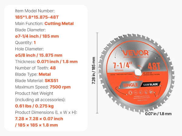 VEVOR Kreissägeblatt (185 mm φ & 48 scharfe Zähne & 1,8 mm Dicke) ideal für Stahl Aluminium, kompatibel mit Kreissäge, Sägeblatt aus legiertem Stahl mit geräuschreduzierenden Wärmeabzügen