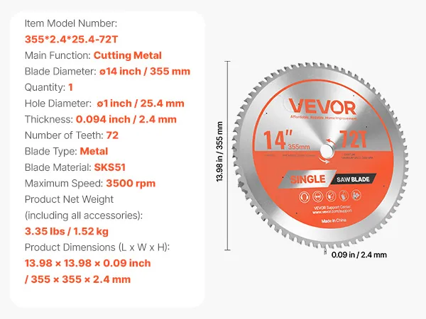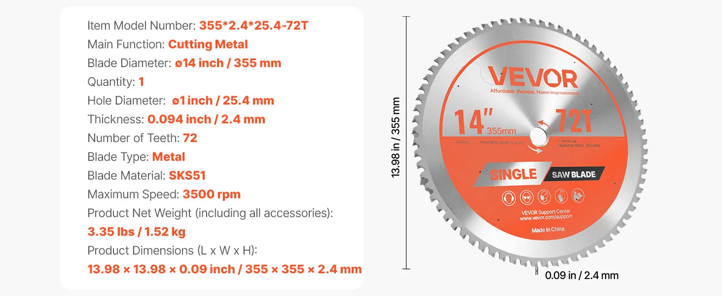 VEVOR Kreissägeblatt (355 mm φ & 72 scharfe Zähne & 2,4 mm Dicke) ideal für Stahl Aluminium, kompatibel mit Kreissäge, Sägeblatt aus legiertem Stahl mit geräuschreduzierenden Wärmeabzügen 1 Stk.