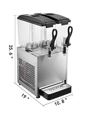 6,3 US-Gallonen-Doppeltank-Kalt- und Heißgetränkeautomat mit großem Auslauf in vernünftiger Konfiguration, ausgezeichneter Leistung, schickem Aussehen und einfacher Bedienung. Vergrößerter Zapfhahn für Fruchtfasern und aromatisierte Körnchen, eine attraktive Art und Weise, Ihren Gästen Ihre Lieblingsspeise zu servieren. BPA-freier PC-Tank, erstklassiger Edelstahl-Maschinenkörper und backlackierte Anrichten bilden einen verschleißfesten und leicht zu reinigenden Gesundheitsschützer. Ein unverzichtbarer Helfer mit ausreichendem Fassungsvermögen für den täglichen Bedarf.