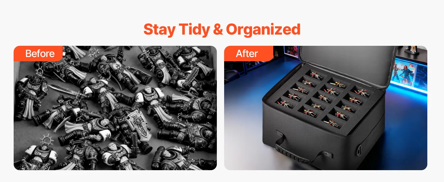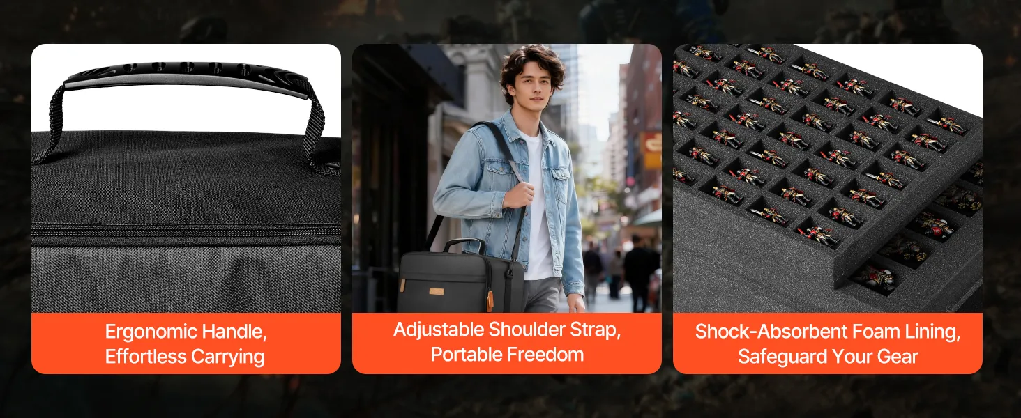 Diese Miniatur-Aufbewahrungstasche ist ideal für Sammler. Die leichte Perlwatte-Polsterung dämpft Stöße und schützt vor Druck, sodass Ihre Modelle sicher, ordentlich aufbewahrt werden. Mehrere Fächer bieten Platz für Spielmaterialien – Reisen, Conventions oder den täglichen Gebrauch.