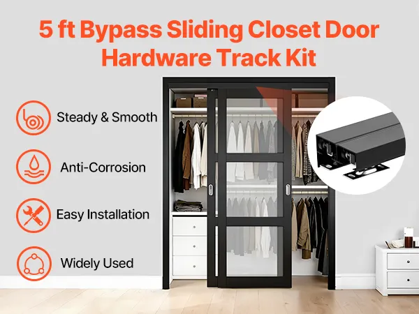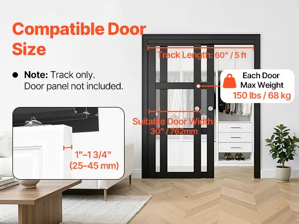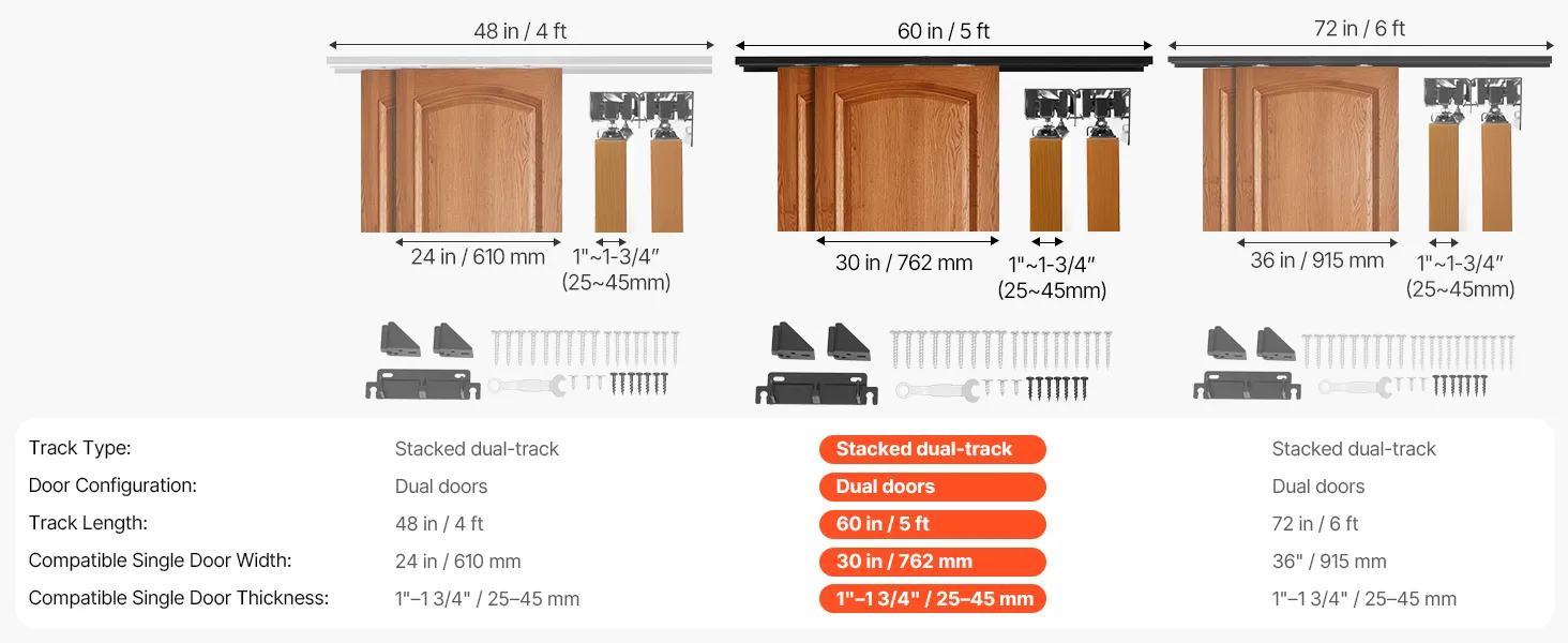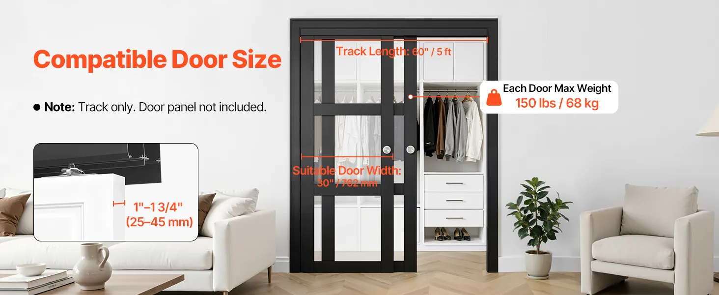 VEVOR Schiebetürbeschlag-Set 1524 mm, Doppelschiebetürschiene aus Aluminiumlegierung, Doppelspuriges Schiebetürsystem für Schränke (25–45 mm Dicke / 762 mm Breite), Leichtgängig & Leise