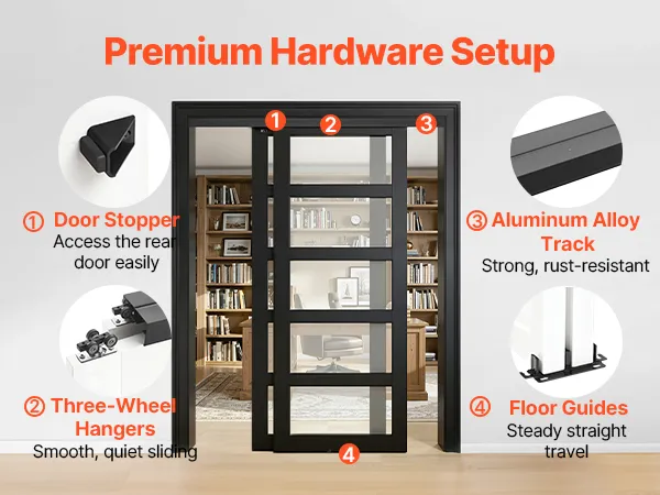 Stabiler Betrieb: Unsere Schiebetürbeschläge für Kleiderschränke umfassen Türstopper für einen bequemen Zugang zur hinteren Tür und Bodenführungen, die für einen geraden Türlauf sorgen. Zusammen gewährleisten sie, dass Ihre Tür während des gesamten Auszugs ausgerichtet und stabil bleibt – für eine sichere Nutzung