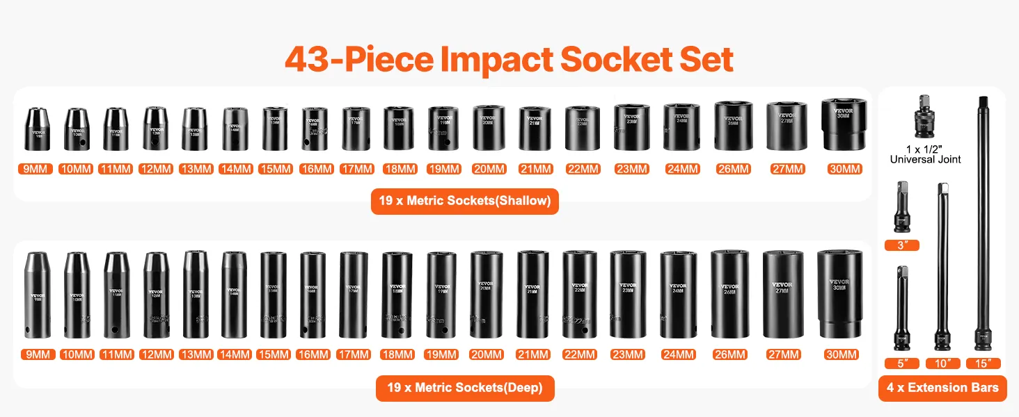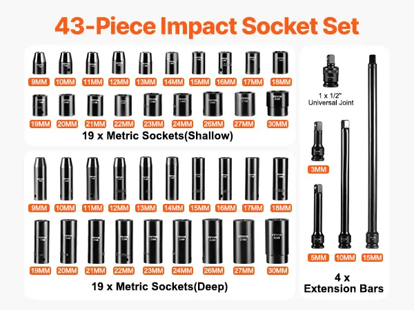 38 sockets included: This power-saving 1/2" drive impact socket set comes with 19 standard sockets: 9mm, 10mm, 11mm, 12mm, 13mm, 14mm, 15mm, 16mm, 17mm, 18mm, 19mm, 20mm, 21mm, 22mm, 23mm, 24mm, 26mm, 27mm, 30mm; 19 deep sockets: 9mm, 10mm, 11mm, 12mm, 13mm, 14mm, 15mm, 16mm, 17mm, 18mm, 19mm, 20mm, 21mm, 22mm, 23mm, 24mm, 26mm, 27mm, 30mm; and 4 extension bars: 3, 5, 10, 15 inches