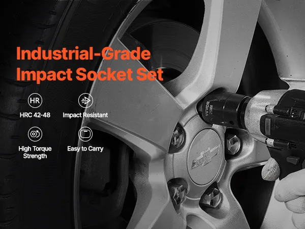 The impact wrench socket set features a 6-point high-torque design that touches and grips the stronger flat sides of the nut or bolt head, not the weaker corners, thus preventing stripping or rounding under high load.