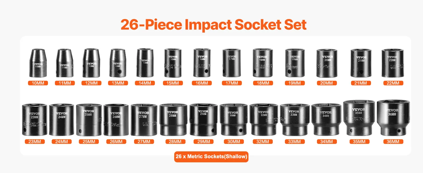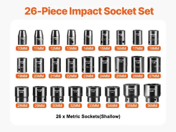 26 sockets included: This effortless 1/2-inch drive impact socket set comes with 26 flat impact sockets: 10 mm, 11 mm, 12 mm, 13 mm, 14 mm, 15 mm, 16 mm, 17 mm, 18 mm, 19 mm, 20 mm, 21 mm, 22 mm, 23 mm, 24 mm, 25 mm, 26 mm, 27 mm, 28 mm, 29 mm, 30 mm, 32 mm, 33 mm, 34 mm, 35 mm, 36 mm