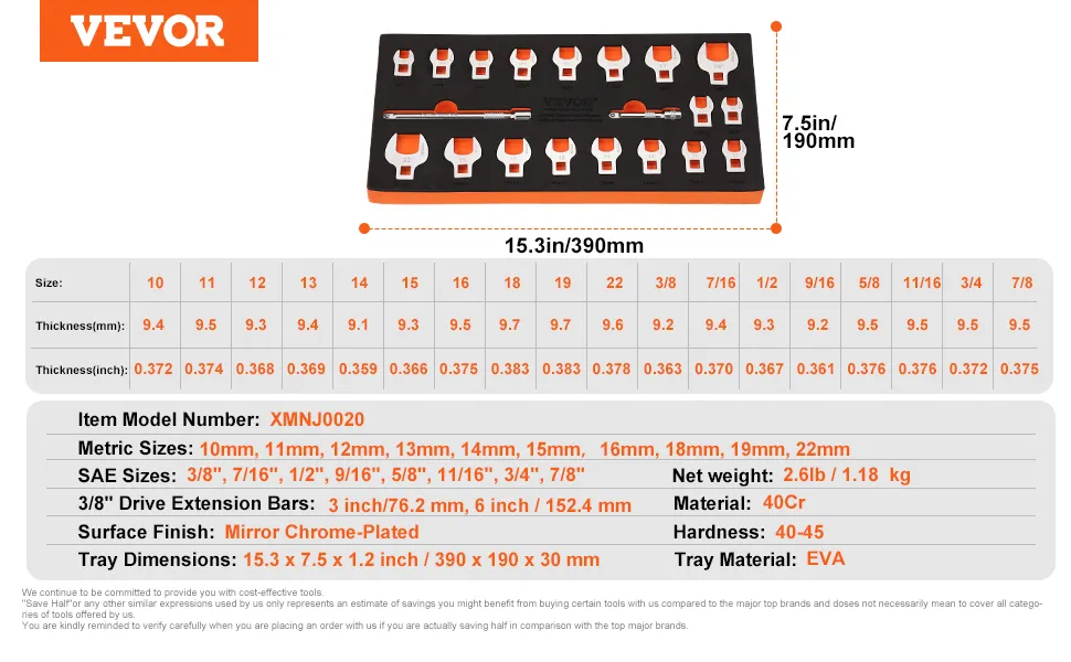 VEVOR Crowfoot-Schlüsselsatz, 9,525 mm Antrieb, 20-teiliger Crowsfoot-Schlüsselsatz mit 2 Verlängerungsstangen und EVA-Werkzeug-Organizer, SAE 3/8-2.22cm und metrisch 10-22mm, 40CR-Material