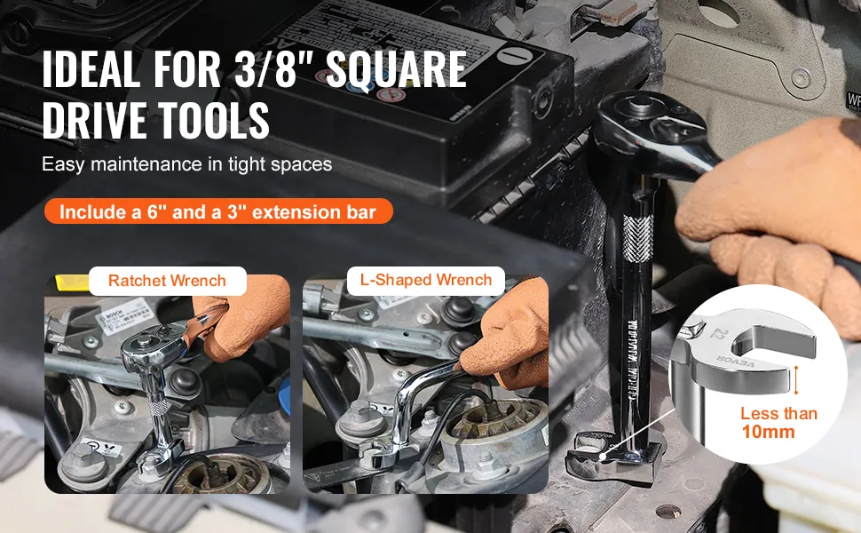 Vielseitige Kompatibilität: Wenn Sie in engen Räumen und schwer zugänglichen Bereichen arbeiten, benötigen Sie ein vielseitiges Werkzeug. Unser 3/8-Zoll-Vierkantschlüssel ist so konzipiert, dass er mit verschiedenen Werkzeugen wie 3/8-Zoll-Verlängerungen, Ratschen und Drehmomentschlüsseln kompatibel ist. Er gewährleistet präzises Befestigen und Demontieren in komplexen Umgebungen. Das Set enthält zwei 3/8-Zoll-Verlängerungen mit einer Länge von 6 Zoll und 3 Zoll, die Ihre Reparaturen bequemer machen.