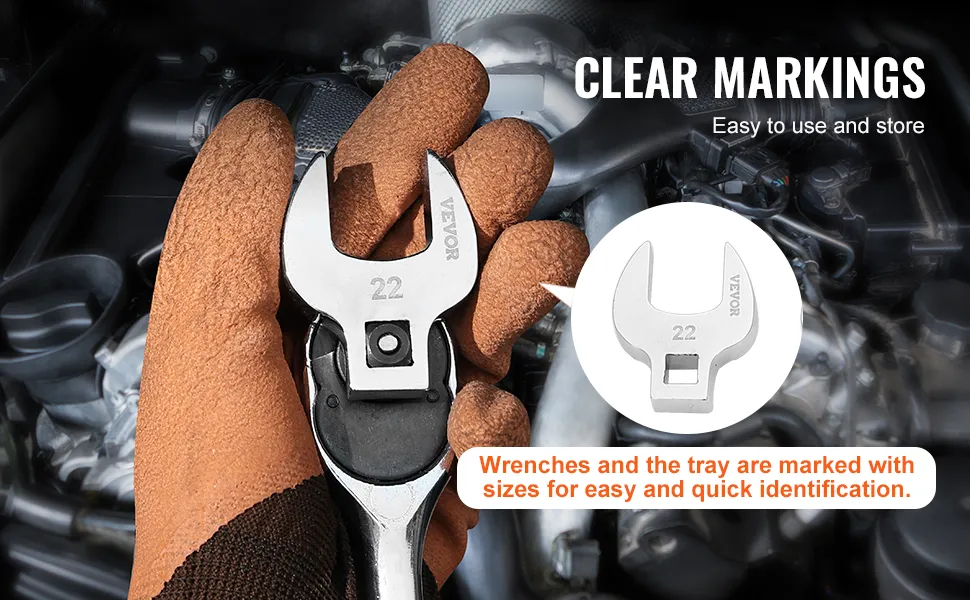 Einfache Identifizierung und Organisation: Jede Schraubenschlüsselgröße ist zur schnellen Identifizierung per Laser auf jeden einzelnen Schraubenschlüssel graviert. Unser Krähenfuß-Schraubenschlüsselsatz wird mit einer stabilen EVA-Schale mit Größenetiketten geliefert, was den Transport, die sichere Aufbewahrung und die schnelle Organisation problemlos macht.