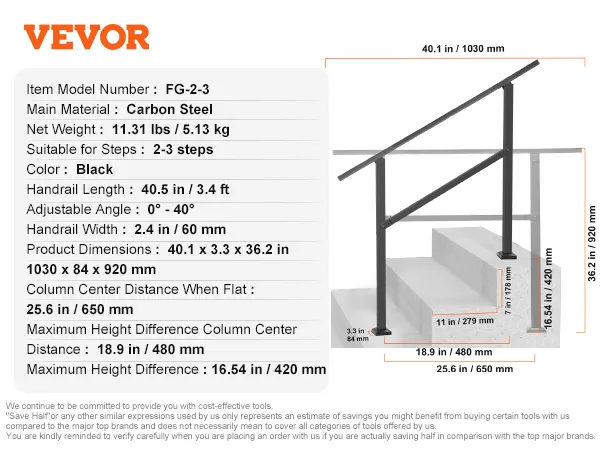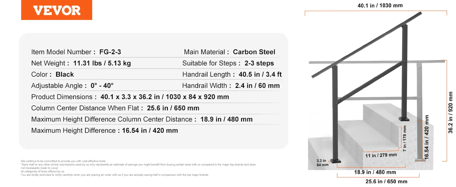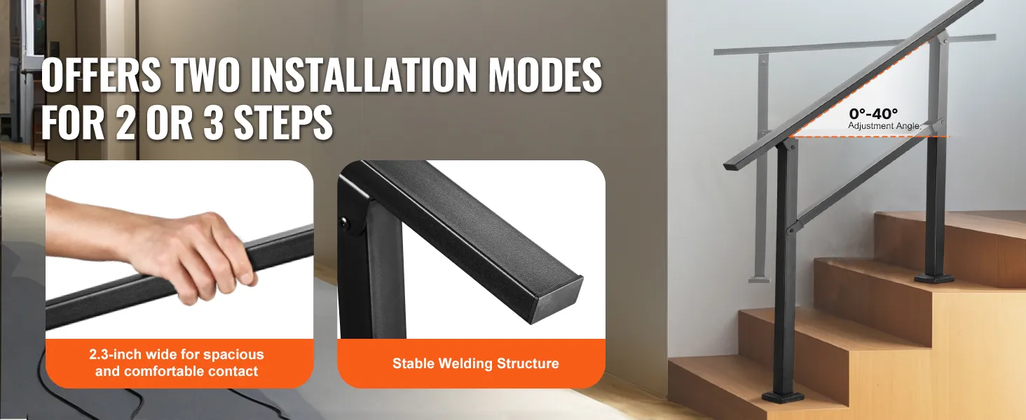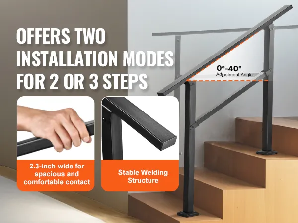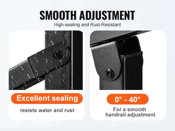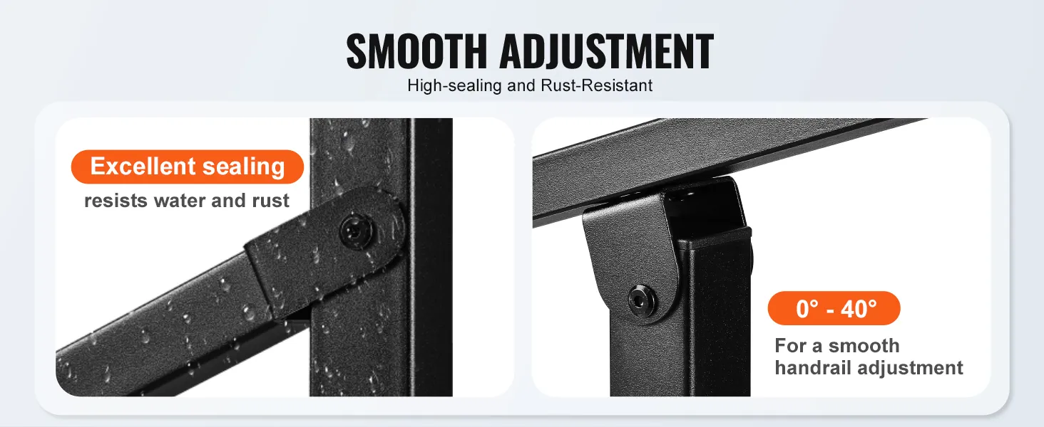 Passend für 2–3 Stufen: Unser Handlauf ist für 2–3 Stufenübergänge geeignet und verfügt über einen einstellbaren Winkelbereich von 0 bis 40 Grad. Er eignet sich perfekt für die meisten Türstufen, Garageneinfahrten und Gartengeländer.