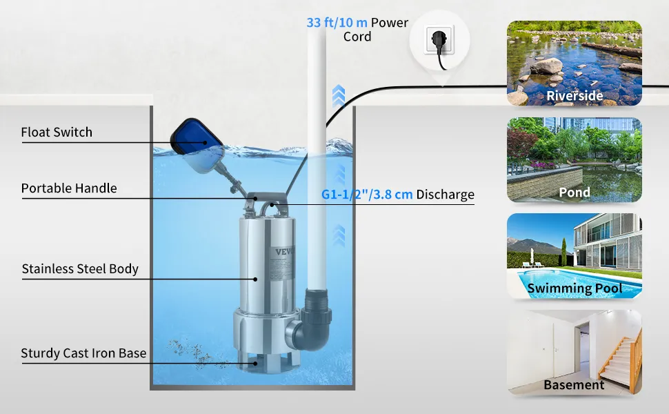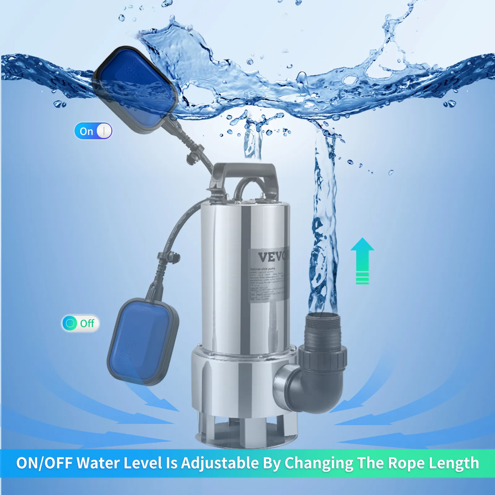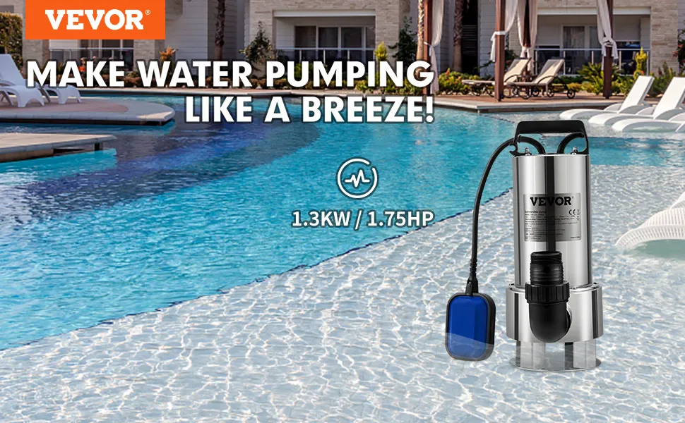 Sorgen Sie sich immer noch um Ihre Entwässerung? Entdecken Sie die Sumpfpumpe von VEVOR. Sie ist mit einem hocheffizienten Motor für optimale Förderleistung ausgestattet. Hochwertige Materialien und eine hervorragende Dichtungsstruktur sorgen für eine lange Lebensdauer. Der automatische Schwimmerschalter gibt Ihnen die Hände frei. Geeignet zum Abpumpen von Wasser aus Schwimmbädern, Kellern, Teichen, Flussufern und anderen überfluteten Gebieten. Starten Sie jetzt mit unserer Tauchpumpe eine einfache und schnelle Wasserableitung!