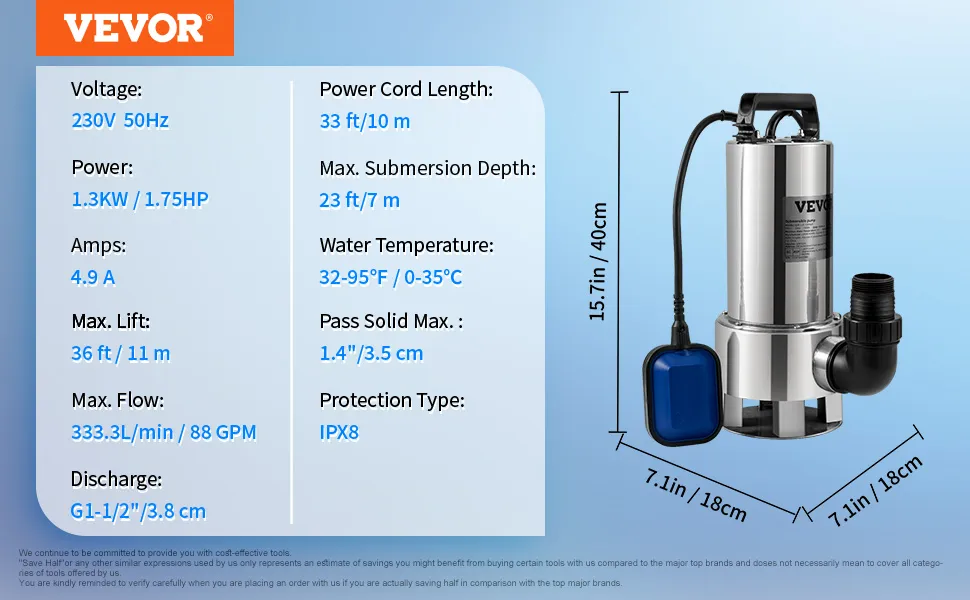 Langlebig: Hochwertige Materialien garantieren erstklassige Ergebnisse. Die Schmutzwasserpumpe verfügt über ein korrosions- und verschleißfestes Edelstahlgehäuse für den langlebigen Einsatz unter Wasser. Sie ist wasserdicht nach IPX8, sodass Sie sich keine Sorgen um die Qualität machen müssen.