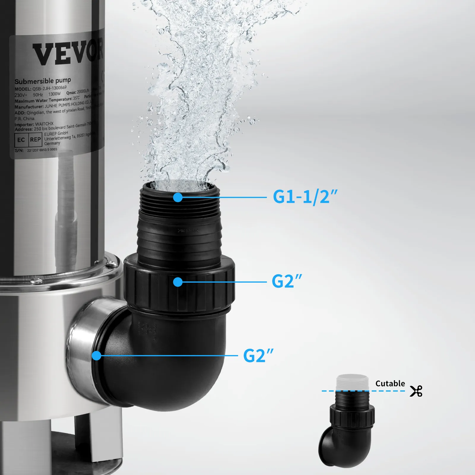 Unsere Tauchpumpe wird mit einem Auslassadapter geliefert, der auf verschiedene Größen zugeschnitten werden kann, um auf verschiedene Schläuche zu passen. Dies macht den Anschluss bequemer und spart zusätzliche Kosten.