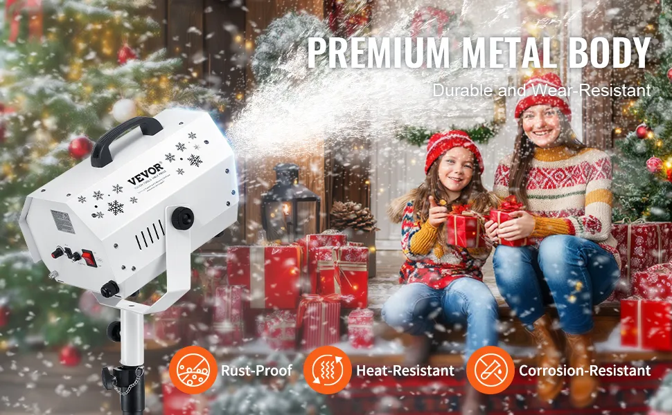 Hocheffiziente Schneeproduktion: Die VEVOR-Schneemaschine verfügt über einen 1200-W-Motor, der über einen längeren Zeitraum eine große Menge realistischer Schneeflocken produzieren kann. Mit einer Sprühdistanz von 3 bis 5 Metern und einer Abdeckungsfläche von 20 m² sorgt sie dafür, dass Ihr Platz wunderschön mit Schnee bedeckt ist.