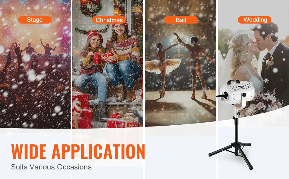 Vielfältige Einsatzmöglichkeiten: Die leichte und tragbare Schneemaschine mit praktischem Griff eignet sich perfekt für Bühnenauftritte, Einkaufszentren, malerische Gegenden, Hochzeiten, Firmenveranstaltungen und Fernsehproduktionen. Sie ist ideal, um bei Partys, Konzerten, Hochzeiten, DJ-Sets, Hauspartys und Karaoke-Events eine festliche Atmosphäre zu schaffen.