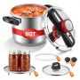 Leichtgängiges Verriegelungssystem: Dank des stufenlosen Verriegelungsmechanismus mit Drehknopf lässt sich unser Multikocher-Schnellkochtopf einfach mit einer Hand öffnen und schließen. Der ergonomische Soft-Touch-Griff und die hitzebeständigen Seitengriffe sorgen für sicheren und komfortablen Halt bei jedem Kochvorgang – ideal für den täglichen Gebrauc