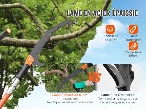 Das ist noch nicht alles: Die ausziehbare Baumschere von VEVOR verfügt über ein Doppelhaken-Design, das sich bei feststeckenden Ästen und verhedderten Zweigen als praktisch erweist. Dieses Design eignet sich hervorragend zum mühelosen Einfangen und Abschneiden von Ästen in einem Durchgang. Und was noch wichtiger ist: Sie müssen sich keine Sorgen machen, dass diese scharfe Stahlklinge rostet oder einen hohen Wartungsaufwand erfordert wie andere Klingentypen.