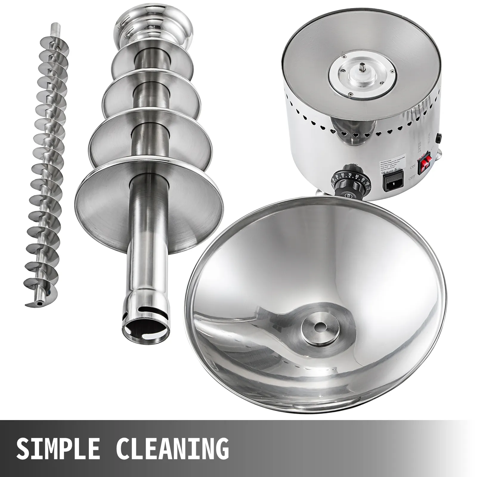 Leicht zu montieren und zusammenzubauen. Dieser Schokoladenbrunnen kann zur einfachen Reinigung in vier Teile zerlegt werden. Bitte tauchen Sie den elektrischen Teil nicht in Wasser oder andere Flüssigkeiten ein.