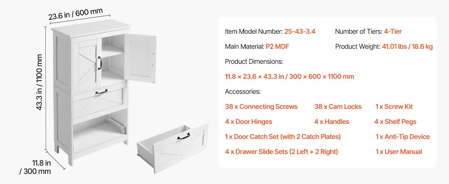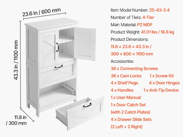 Geräumiger Stauraum: Mit den Maßen 11,8 x 23,6 x 43,3 Zoll (30 x 60 x 110 cm) verfügt dieser Badezimmer-Unterschrank über zwei Schubladen und zwei Ablagen – ideal für Handtücher, Toilettenpapier, Seife, Kosmetika und Duschutensilien. Die offene Oberseite eignet sich hervorragend zur Präsentation von Kunstwerken oder Vasen