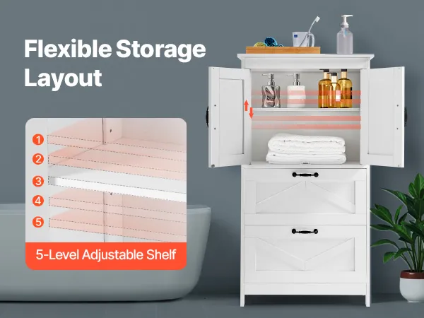 Die voreingestellten Regallöcher ermöglichen eine einfache Höhenverstellung auf fünf Ebenen und bieten Platz für verschiedene Gegenstände, darunter Seifenschalen, Hautpflegeprodukte, Waschmittel und Handtuchkörbe. Dieses Design erhöht die Funktionalität unseres Badezimmer-Bodenschranks erheblich.