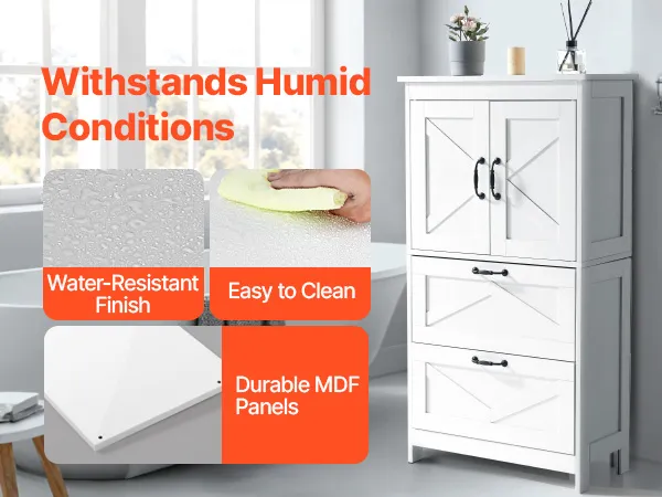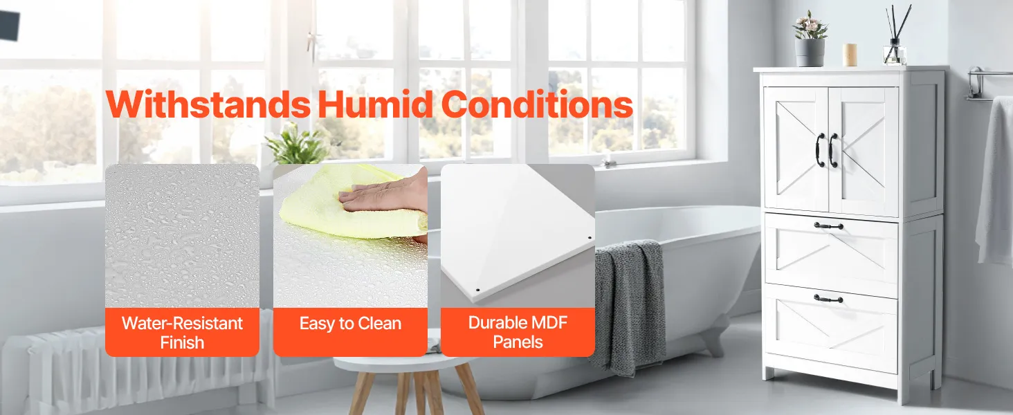 Dieser weiße Aufbewahrungsschrank aus hochwertigem P2-MDF ist mit einer wasserdichten Beschichtung versehen, die es ermöglicht, feuchten Badezimmerumgebungen standzuhalten. Die gleichmäßige Dichte und die dichte Innenstruktur von MDF machen ihn stärker und stabiler als herkömmliches Holz oder Kunststoff. So ist er besonders langlebig und neigt nicht zu Verformungen oder Rissbildung.
