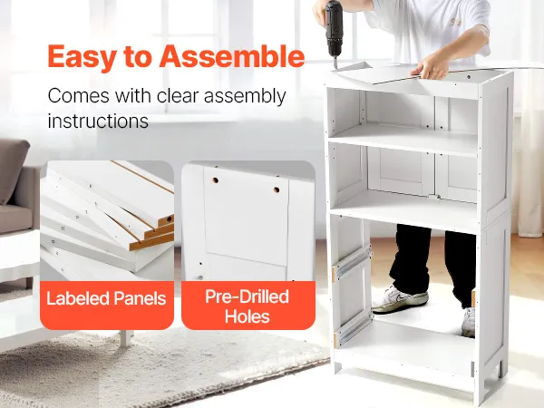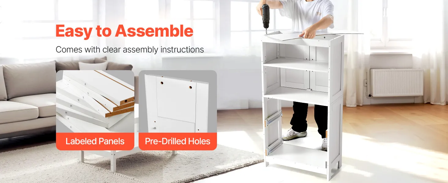 Der freistehende Küchenschrank wird mit sämtlichem erforderlichen Zubehör und vorgebohrten Löchern geliefert. Jedes Teil ist deutlich nummeriert, um die Montage einfach und unkompliziert zu gestalten.